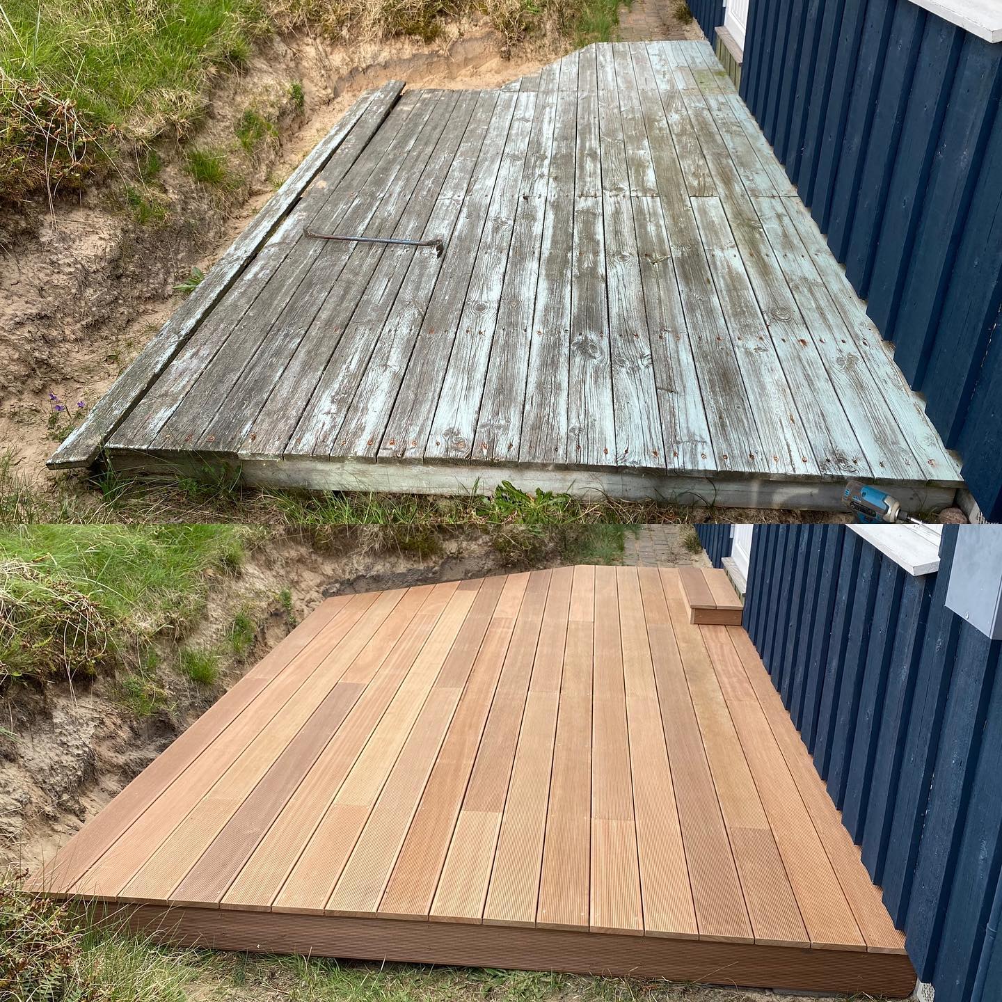 Før- og efterbillede af ny træterrasse i Brønderslev